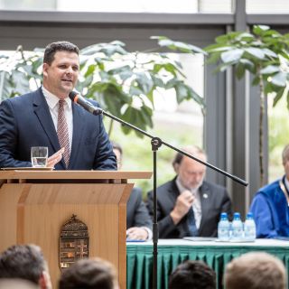 Die traditionelle Rede der Jahrgangssprecher übernahmen in diesem Jahr Felix Harder und Jan-Philipp Heinrich. Während ersterer allen Beteiligten für die Diplomverleihung in dem außerordentlich feierlichen Rahmen dankte, erinnerte Heinrich an das richtige Bauchgefühl, das sie wohl alle vor sechs Jahren gehabt hätten, als sie sich für den Weg über Ungarn und schließlich nach Hamburg entschieden hätten. Mit Blick auf die Semmelweis Universität und den ACH hob er einen Aspekt besonders hervor: „Sie haben uns in den Jahren etwas ganz Wichtiges geschenkt: Zeit. Zeit, die wir nicht warten oder Umwege gehen mussten. Sie haben uns allen diese kostbare Zeit geschenkt, um das zu tun, was wir mit Leidenschaft tun wollen: Mediziner sein.“