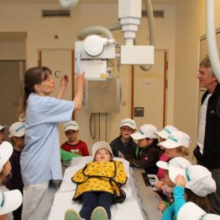 Notaufnahme statt Morgenkreis lautete die Devise für die Kinder und Betreuer am vergangenen Donnerstag. Nach einem kurzen Gruppenfoto im Eingangsbereich starteten die 4-5 Jährigen ihren Rundgang durch die Klinik. Gleich zu Beginn ging es in die Notaufnahme. Dort zeigte ihnen das Pflegepersonal wie ein Verband anzulegen ist und der Blutdruck gemessen wird. Dann wartete schon das nächste Highlight auf die Vorschüler von heute und möglichen Ärzte von morgen. Sie erlebten wie ein Röntgenbild gemacht wird und was darauf zu sehen ist. Kein Arm oder Bein, sondern ein Umschlag mit verschiedenen Gegenständen wurde durchleuchtet. Auf dem fertigen Röntgenbild konnten die Kinder dann erraten, was darauf zu sehen ist.