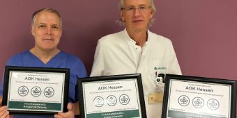 Auch das Endoprothetikzentrum, unter Leitung von Chefarzt Dr. Karol Stiebler, wurde mit einem überdurchschnittlich guten Ergebnis bewertet – und das zum wiederholten Male. Der Fachbereich Orthopädie erhielt aufgrund seiner herausragenden Kompetenz in diesem Jahr gleich zweimal die Bestnote „3 AOK-Bäumchen“ – sowohl im Leistungsbereich „Hüftgelenkersatz“ als auch im Bereich „Kniegelenkersatz“. Die Auszeichnung bescheinigt der Klinik, dass hier eine überdurchschnittlich hohe Qualität erbracht und exzellente Arbeit geleistet wird. Nicht ohne Grund, denn das Endoprothetikzentrum Schwalmstadt gehört deutschlandweit zu den wenigen Kliniken, die minimalinvasive Implantation von Hüftprothesen durchführt. „Bei dieser Methode müssen Muskeln und Sehnen nicht durchtrennt werden“, erklärte Dr. Stiebler, „ein solcher Eingriff führt bei den Patienten zu weniger Schmerzen, kürzeren Krankenhausaufenthalten, kleineren Narben und letztendlich zu einer schnelleren Rehabilitation.“ Auch im Bereich Kniegelenk sind die Spezialisten in Schwalmstadt ganz weit vorn, denn sie können computernavigierte Implantationen von Knieendoprothesen durchführen. Diese Technik ermöglicht ein hohes Maß an Präzision. Mit Chefarzt Dr. Stiebler freuen sich die Hauptoperateure Marina Heinmöller und Dieter Andrev sowie das gesamte Team über diese großartige Gemeinschaftsleistung.